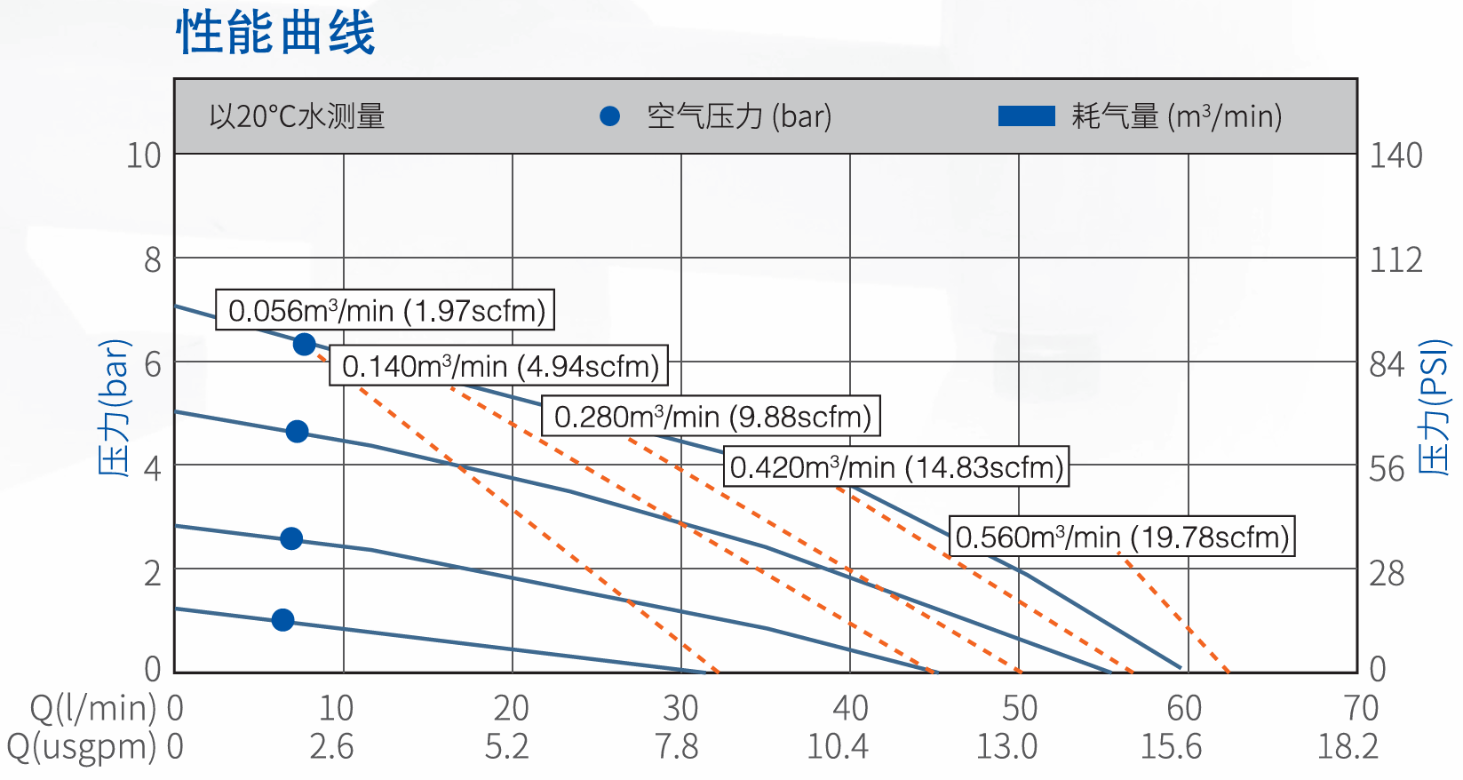 7. 可通過改變進氣量與壓力,來調(diào)整輸送的流量與揚程